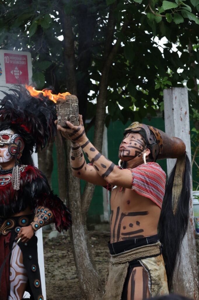 La ceremonia fue encabezada por el coordinador de Culturas Populares y maestro de lengua maya, Román Pat, quien realizó el ritual tradicional de petición de permiso a los cuatro puntos cardinales, como dicta la cosmovisión maya, y destacó la participación de los danzantes mayas de Mayapax.