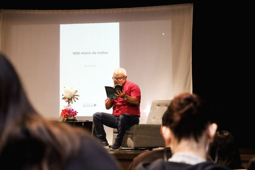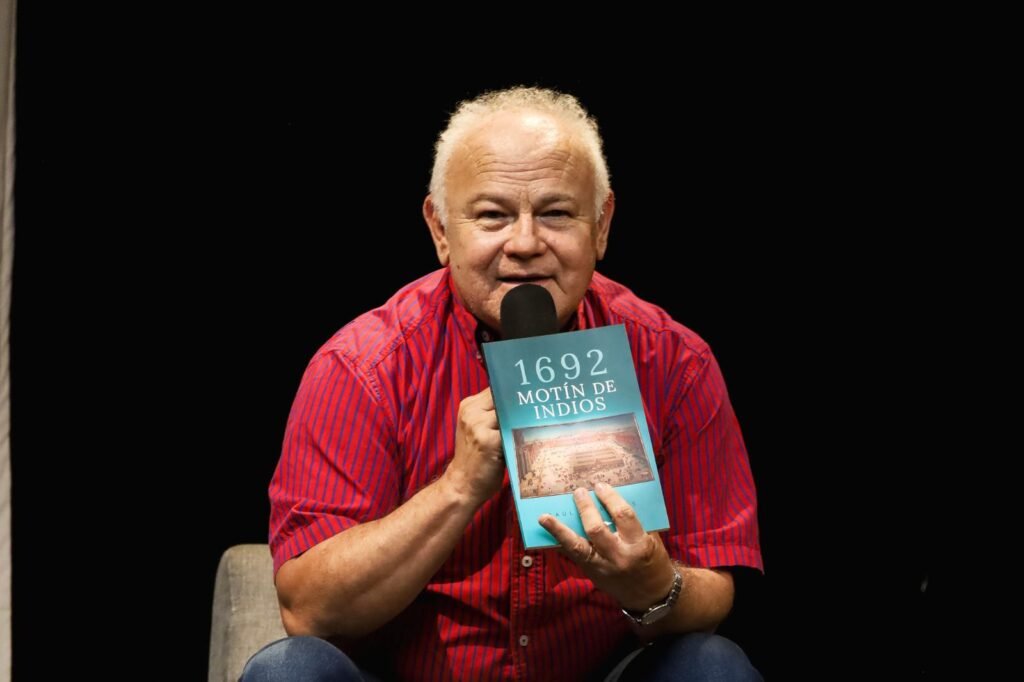 Al cierre del conversatorio, el académico presentó su novela “El motín de los indios”, inspirada en el incendio del Palacio Nacional ocurrido en 1692 en la Ciudad de México.